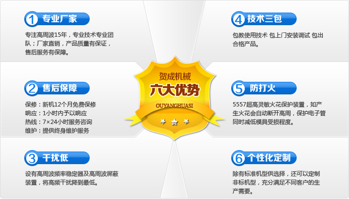賀成機(jī)械專業(yè)生產(chǎn)高周波設(shè)備、精制高周波模具、供應(yīng)高周波配件和耗材、提供高周波維修、高周波加工及高周波出租服務(wù)。專注高周波15年,為廣大高周波用戶提供一站式采購(gòu)、服務(wù)平臺(tái)。